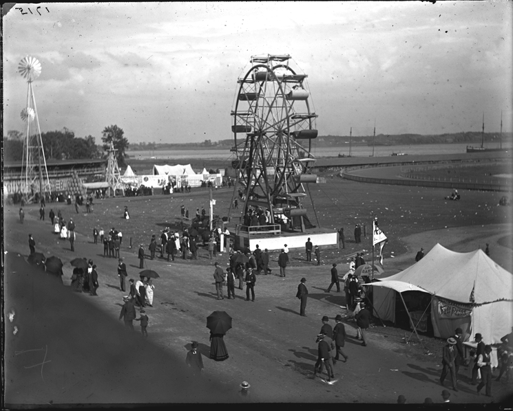 View of the Beach Observation Wheel at the Michigan State Fair with people milling about below it and the Detroit River in background. Recorded in glass negative ledger: "LM/State fair."
