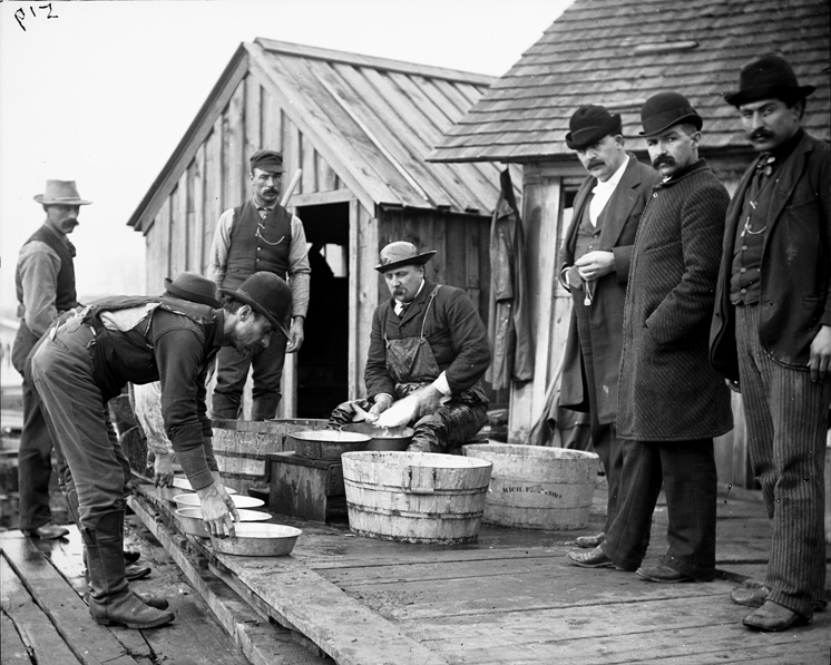 Group of fishermen stand on dock. Recorded in glass negative ledger: "M/Fishing."
