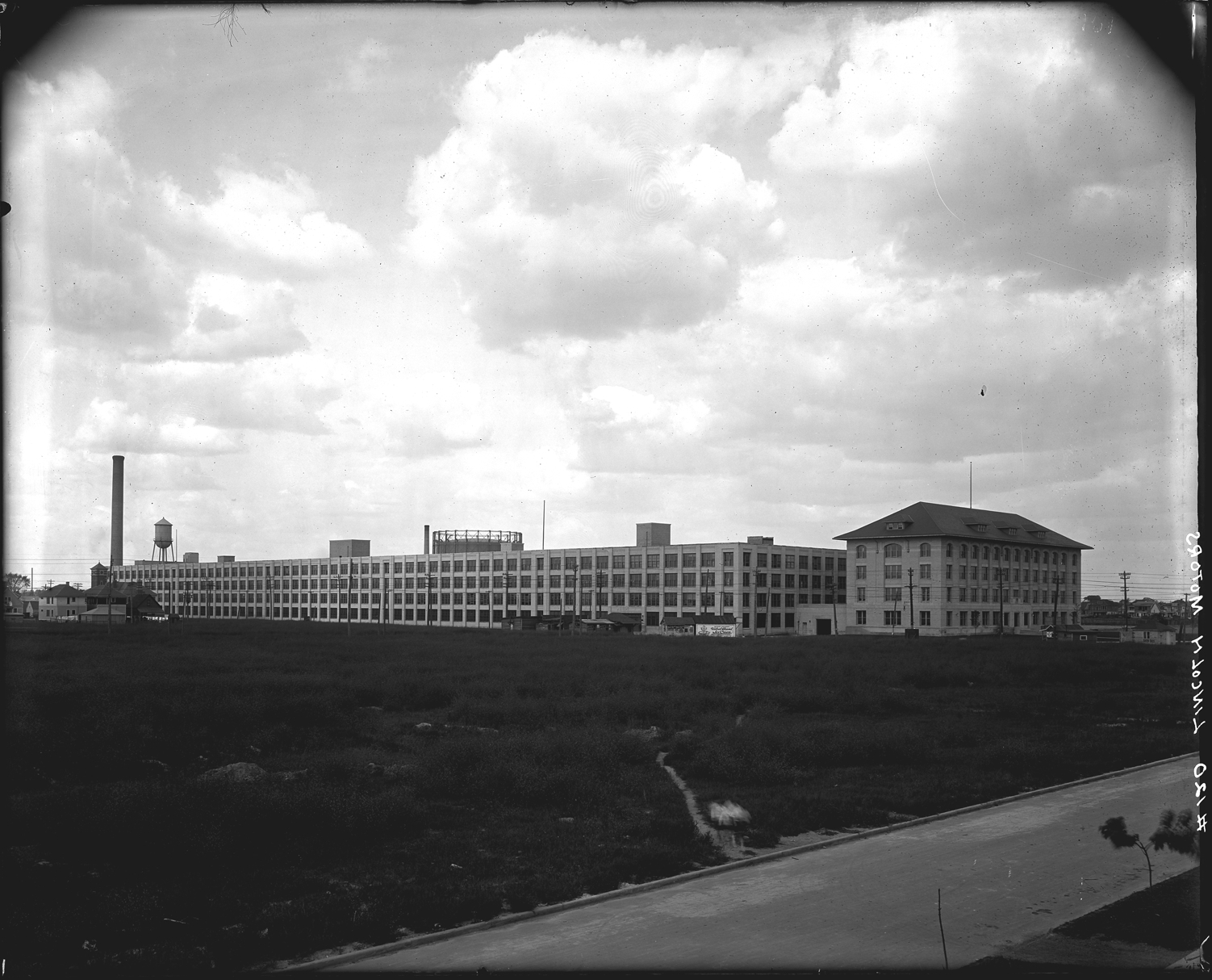 View of the Lincoln Motor Company on West Warren and Livernois, the building was design by George Mason and built in 1917, in 1922 Albert Kahn expanded the plant. Recorded in glass negative ledger: "M/Automobile industry & trade-Lincoln motor co."