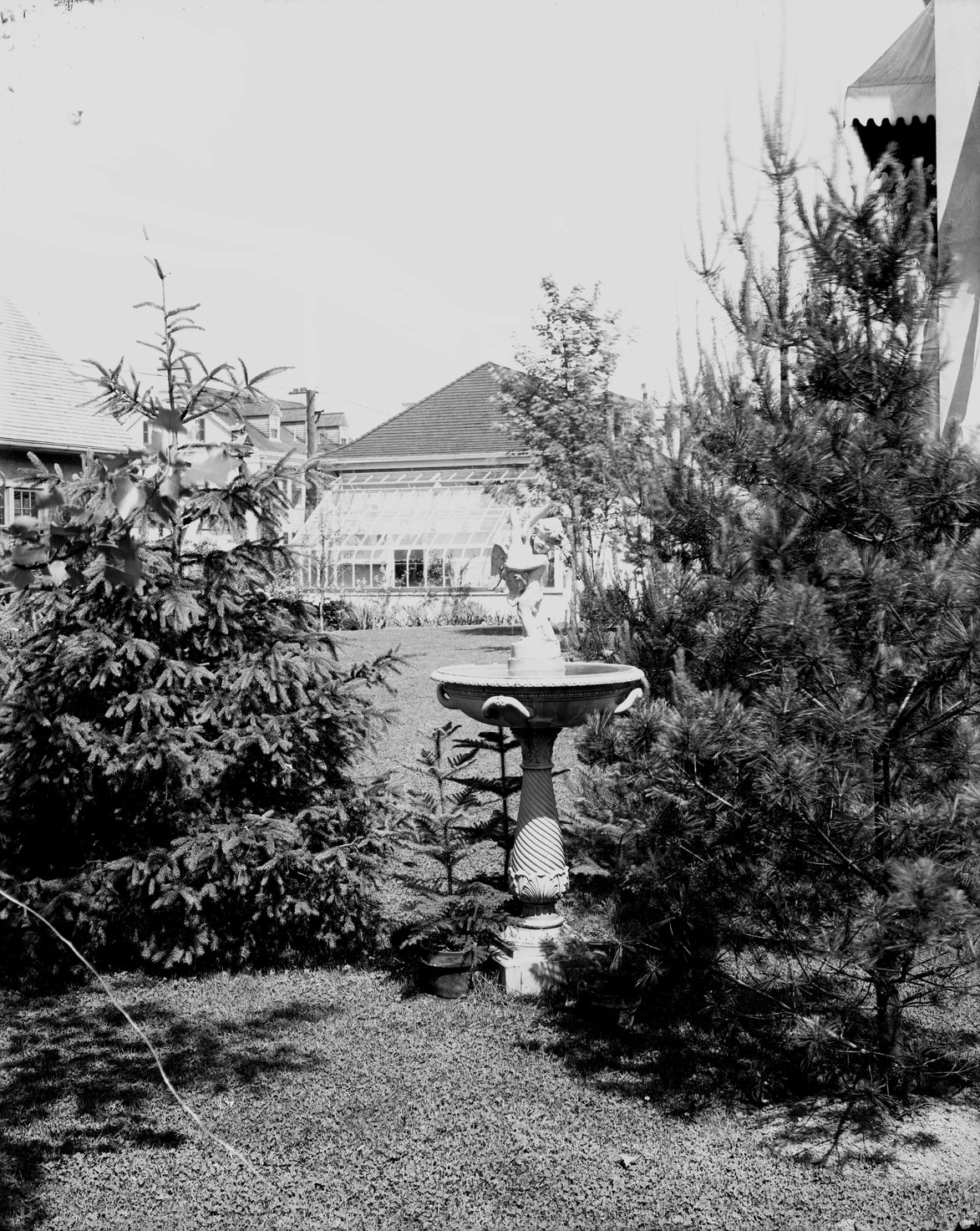 View of small fountain with statue of child or cherub holding a bird or waterfowl; fountain flanked by trees; conservatory or greenhouse in background. Recorded in glass negative ledger: "M/Localities-Grosse Pointe-Historic houses-Gray, David."