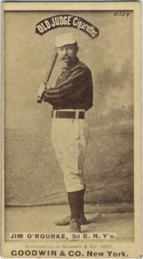 Portrait of Jim O'Rourke, third baseman for the New York Giants. Posed in studio wearing uniform with striped shirt, facing camera with bat back. Old Judge (N172) series. Printed on front: "0324. Old Judge cigarettes. Jim O'Rourke, 3d B., N.Y.'s. Copyrighted by Goodwin & Co., 1887. Goodwin & Co., New York."