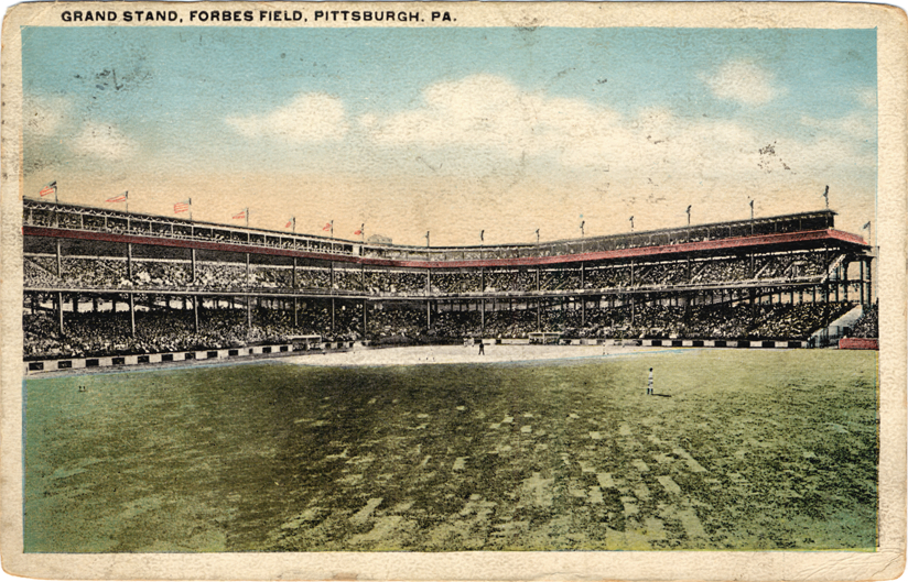 View from outfield of baseball game at Forbes Field in Pittsburgh, Pennsylvania. Crowds fill grandstand at ballpark. Printed on front: "Grand stand, Forbes Field, Pittsburgh, Pa." Printed on back: "Union News Co., New York and Pittsburgh." Handwritten on back: "July 9th, Leaving for the west 4-55. Now connected with the Mitchell. R. Gedye." Card is postmarked July 9, 1917.