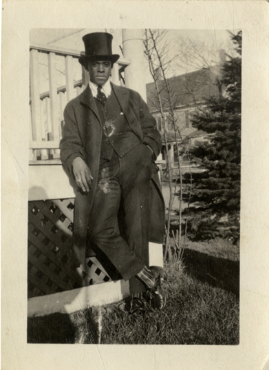 View of tenor Roland Hayes, wearing suit and top hat, posing next to house.