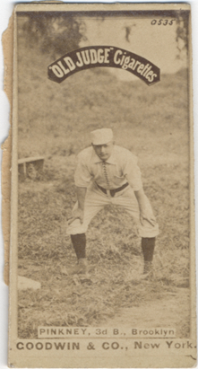 Portrait of George Pinkney, third baseman for Brooklyn team. Posed in studio wearing uniform in front of bleacher backdrop, crouching with hands on knees. Old Judge (N172) series. Printed on front: "0535. Old Judge cigarettes. Pinkney, 3d B., Brooklyn. Goodwin & Co., New York."