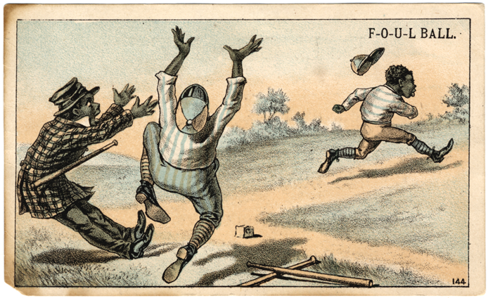 View of three boys playing baseball; one player leaps to catch a fly ball, player behind home plate is struck with a bat. Printed on front: "F-o-u-l ball." Printed on back: "F.L. Cran[e] ... wholesale and retail hatter and furrier, ladies' cloaks of all kinds. 324 Lackawanna Avenue, Scranton, Pa."