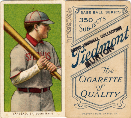 Portrait of Jap Barbeau, baseball player for the St. Louis Cardinals, holding a baseball bat. White Borders (T206) series. Printed on front: "Barbeau, St. Louis Nat'l." Printed on back: "Piedmont, the cigarette of quality. Base ball series, 350 subjects. Factory no. 25, 2d. dist. Va."