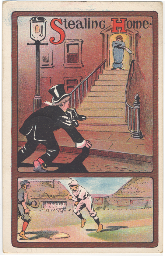 View of man wearing top hat attempting to sneak up the front steps. Man carries shoes in his mouth; his wife waits for him at the top of the stairs with a rolling pin. Second view is of baseball player running toward home plate. Printed on front: "Stealing home." Handwritten on back: "Does anything happen in Ithaca like this. Tina." Card is postmarked June 19, 1911.