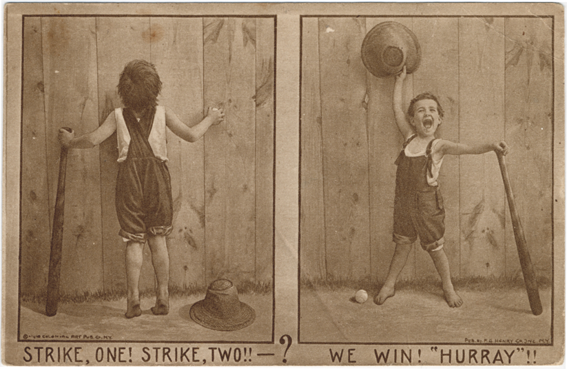 Two views of young boy with straw hat and baseball bat. On left, boy looks through knothole in wooden fence; on right, boy holds bat in one hand and holds hat over his head. Printed on front: "Strike, one! Strike, two!! -- ?; We win! 'Hurray'!! [Copyright] 1910 Colonial Art Pub. Co. N.Y.; pub. by F.G. Henry Co., Inc., N.Y." Handwritten on back: "Hello, We leave tomorrow for a 2 weeks trip. We had a great game today. 4-2. My regards to all, Fred." Card is postmarked May 5, 1910.