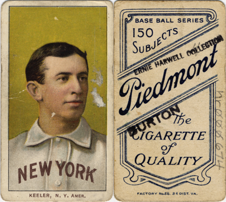 Portrait of Willie Keeler, baseball player for the New York Highlanders. White Borders (T206) series. Printed on front: "Keeler, N.Y. Amer." Printed on back: "Piedmont, the cigarette of quality. Base ball series, 150 subjects. Factory no. 25, 2d. dist. Va."
