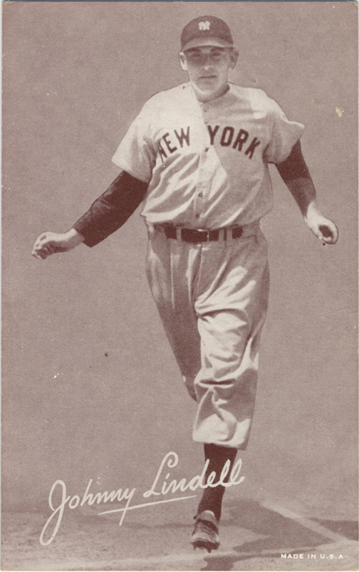 Portrait of New York Yankees outfielder Johnny Lindell. Exhibits (W462) series. Printed on front: "Johnny Lindell. Made in U.S.A."