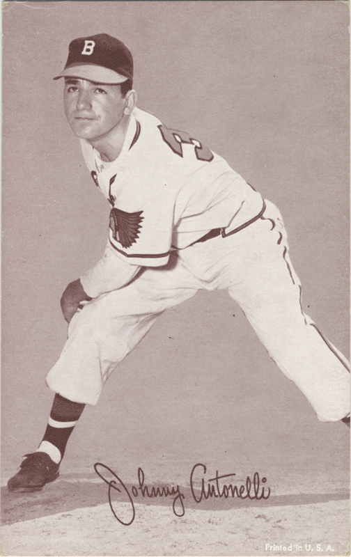 Portrait of Boston Braves pitcher Johnny Antonelli. Exhibits (W462) series. Printed on front: "Johnny Antonelli. Printed in U.S.A."