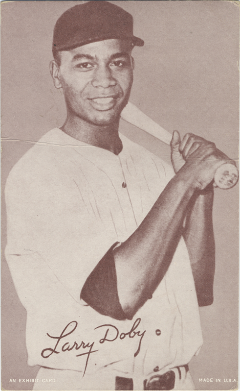 Portrait of center fielder Larry Doby with bat. Exhibits (W462) series. Printed on front: "Larry Doby. An Exhibit card. Made in U.S.A."