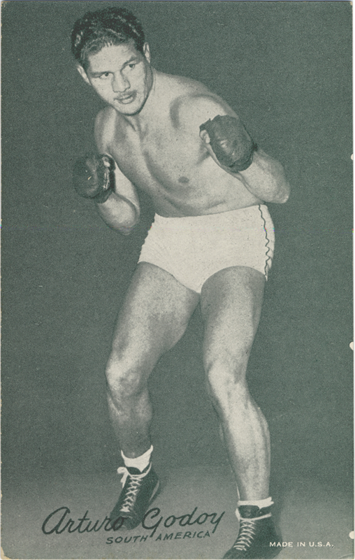 Portrait of boxer Arturo Godoy. Exhibits series. Printed on front: "Arturo Godoy. South America. Made in U.S.A."