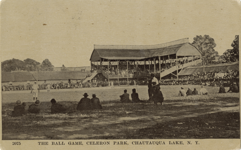 View of baseball game at Celeron Park in Chautauqua Lake, New York. Crowds fill grandstand at ballpark; spectators sit on grass along edges of field in foreground. Printed on front: "The ball game, Celeron Park, Chautauqua Lake, N.Y., 2075." Printed on back: "The H.H. Ham(m) series, Erie, Pa." Handwritten on back: "How is every old thing? Griffin died 23rd of June 1912."