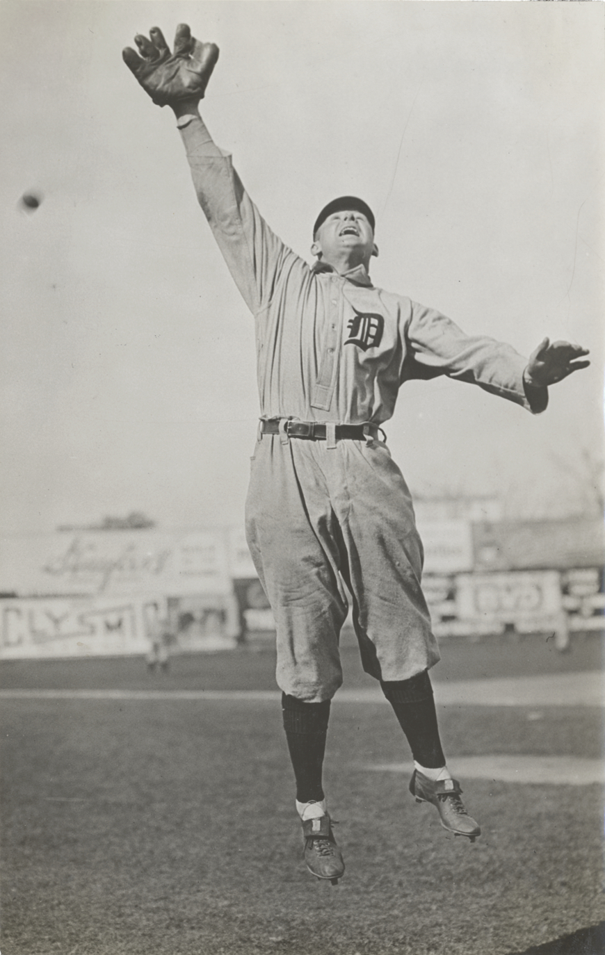 Portrait of Sam Crawford, baseball player for the Detroit Tigers, reaching for a fly ball. Handwritten on back: "Sam Crawford, Detroit."