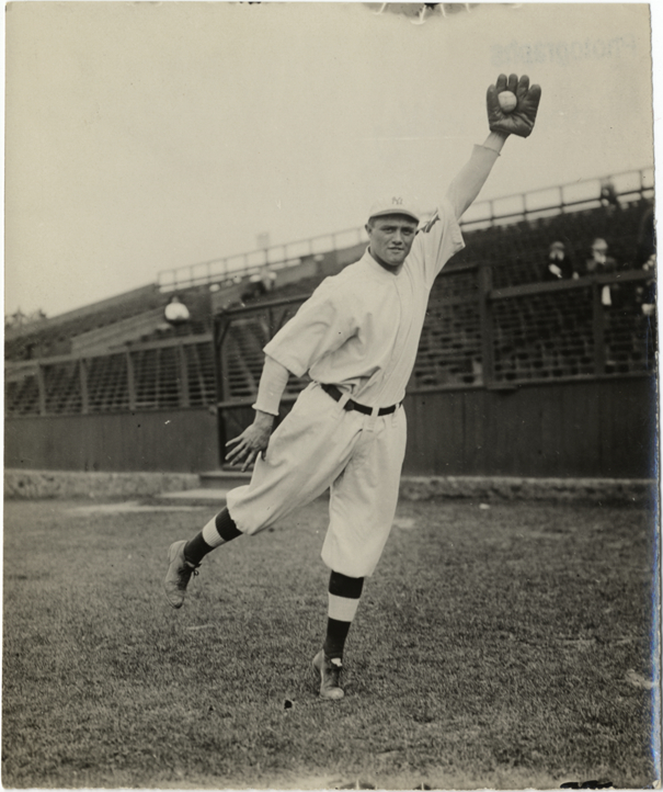 View of baseball player in New York uniform catching a fly ball; bleachers in background. Stamped on back: "Charles M. Conlon, Evening Telegram, New York."