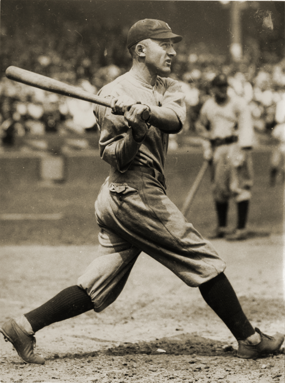 Larry Gardner, Cleveland Indians third baseman, swinging bat on field. Handwritten on back: "Gardner, Lawrence (Cleveland)."