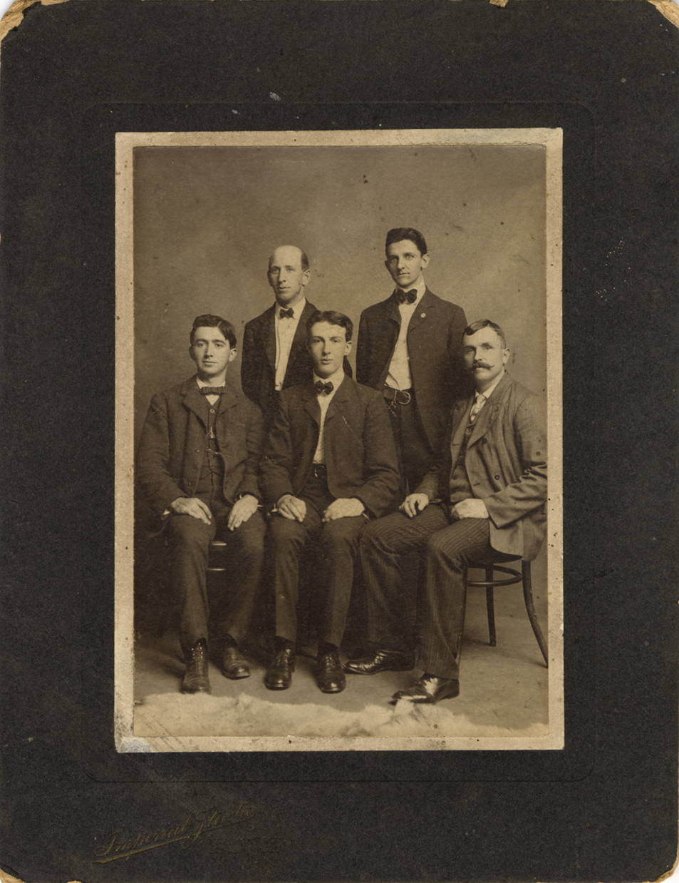 Posed photograph of five men in studio. All wearing suits; two wearing vests; four wearing bow ties with one wearing knotted tie. One has handlebar mustache.