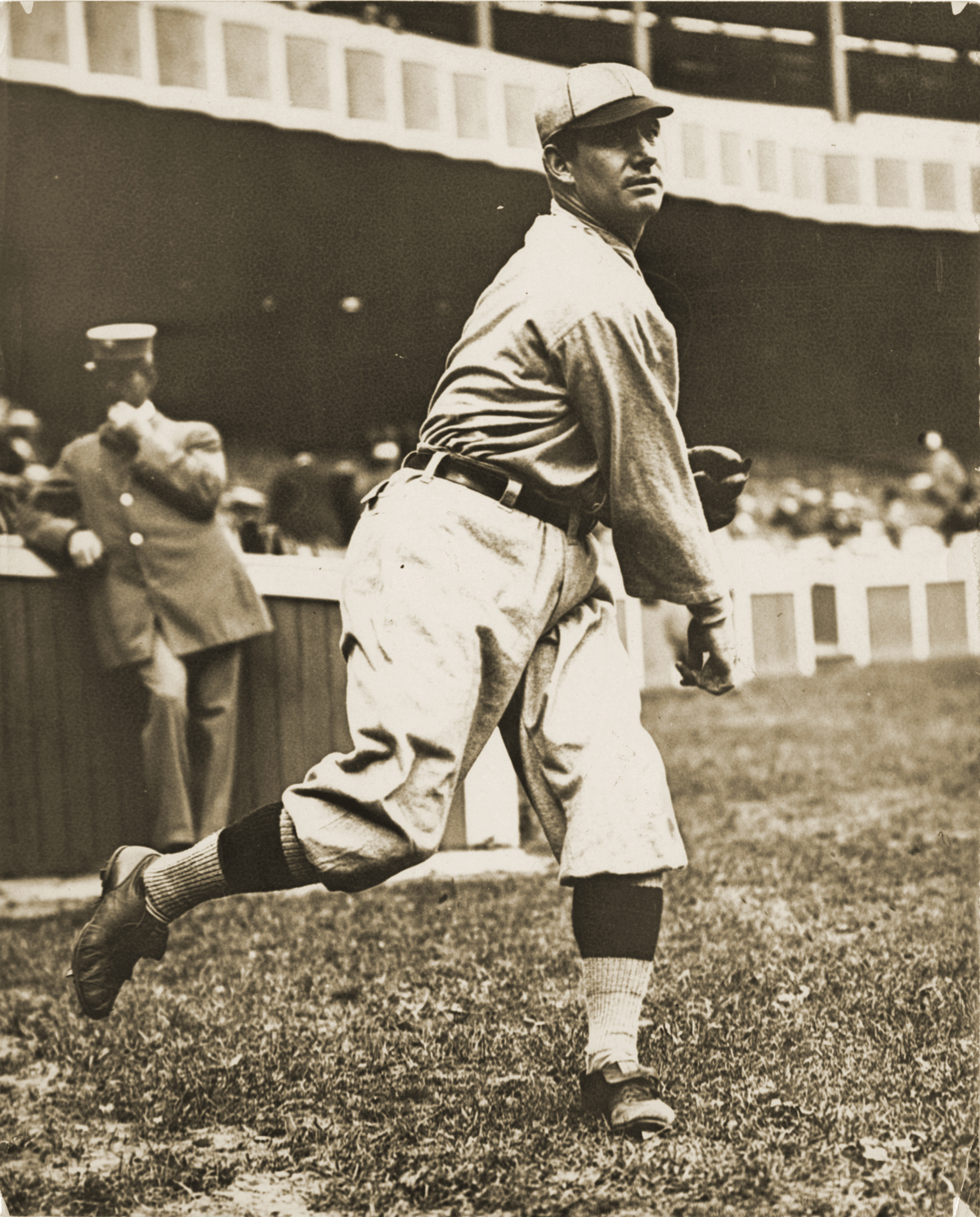 Roger Bresnahan throwing on field. Handwritten on back: "Roger Bresnahan. C-1F."
