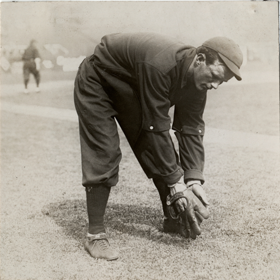 Kid Durbin, Cincinnati Reds baseball player, reaching for grounder on field. Stamped on back: "Charles M. Conlon, 216 W. 111th St., New York." Handwritten on back: "Durbin (Cincinn.), Blaine."