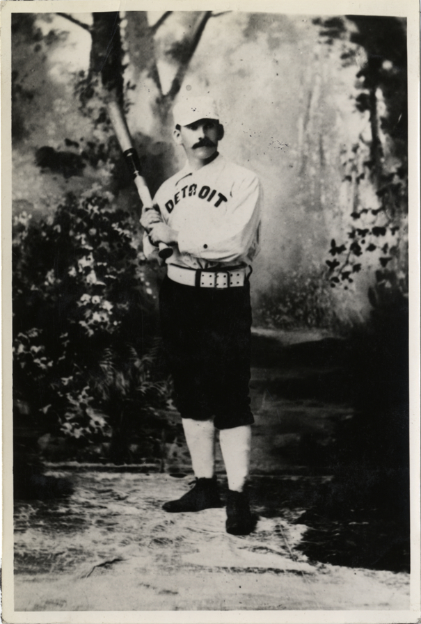 Studio portrait of Fred Dunlap, Detroit Wolverines second baseman, posed with bat in front of woodland backdrop. Stamped on back: "Reproduced by Geo. Burke, 847 Belmont Ave., Chicago, Ill." Handwritten on back: "Fred Dunlap."
