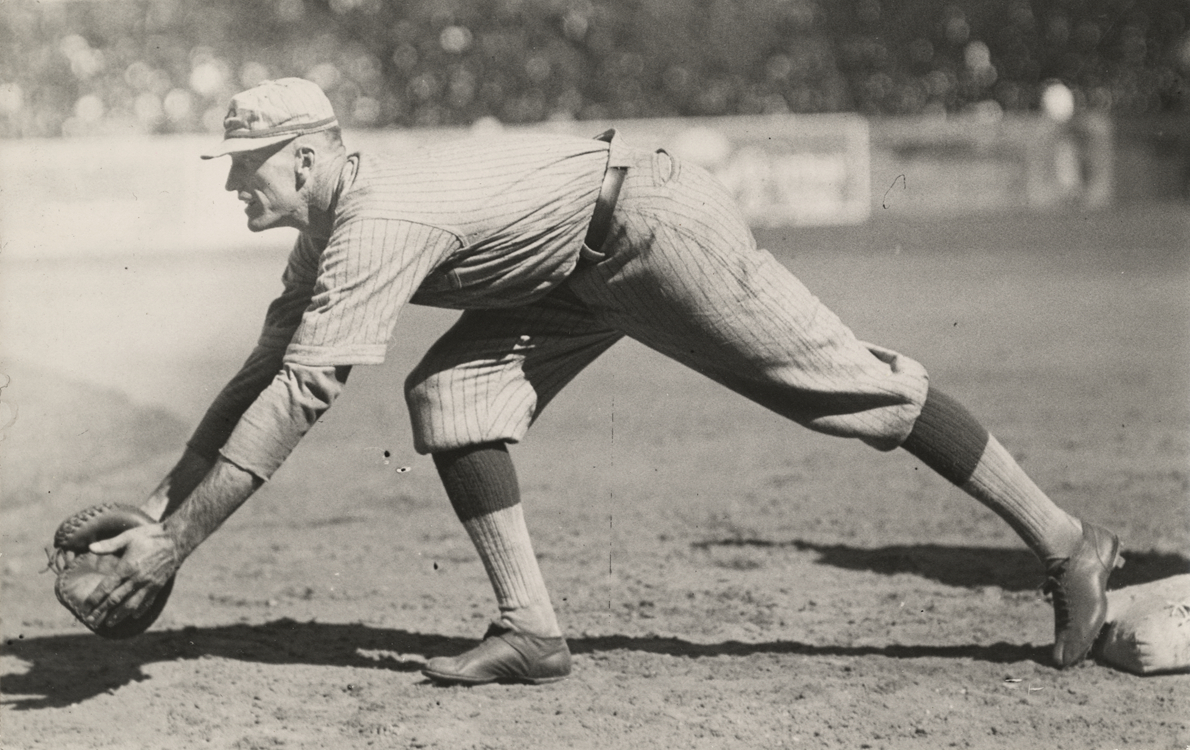 Portrait of Jake Daubert, baseball player for the Cincinnati Reds, reaching for a ground ball. Handwritten on back: "Daubert, Cincinnati."
