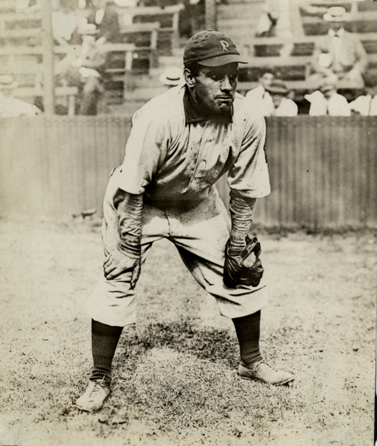 Pittsburgh Pirates third baseman Jap Barbeau with hands on knees. Fans in stands beyond fence. Stamped on back: "Charles M. Conlon, 216 W. 111th St., New York." Handwritten on back: "Wm. J. Barbeau (Pitts.) 1909."
