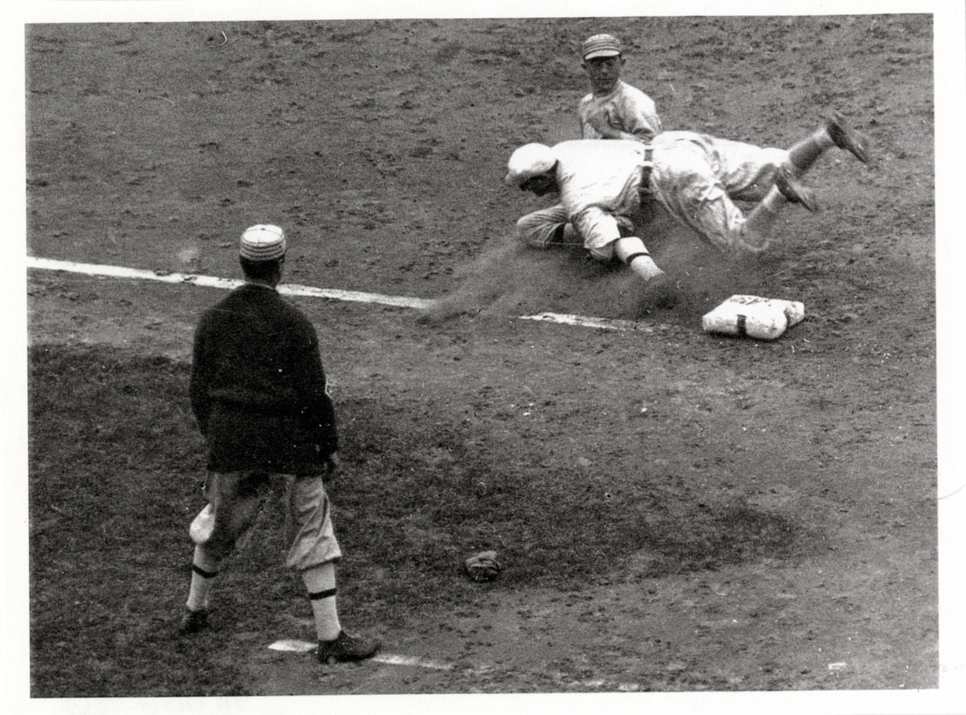 Frank Baker tackled by third baseman. Handwritten on back: "Baker out at third in 1913 W.S. opener."
