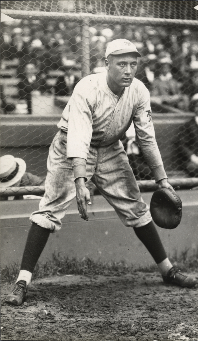 Portrait of baseball player Frank Snyder wearing New York Giants uniform. Typed on label: "Frank Snyder, 1917 [sic]."