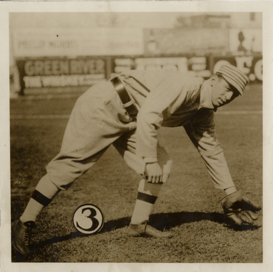 Philadelphia Athletics player Jack Barry, reaching to catch ground ball, with one foot behind. "3" in circle superimposed on photograph. Handwritten on back: "Barry, Athletics, 1914."