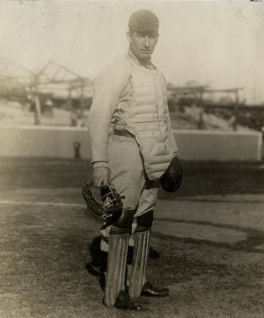 Roger Bresnahan in protective gear, standing on field. Stamped on back: "Charles M. Conlon, 216 W. 111th St., New York." Handwritten on back: "Roger Bresnahan (N.Y. Nat.)."