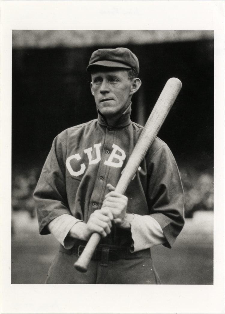Portrait of Johnny Evers, Chicago Cubs second baseman, posed with bat. Handwritten on back: "John Evers."