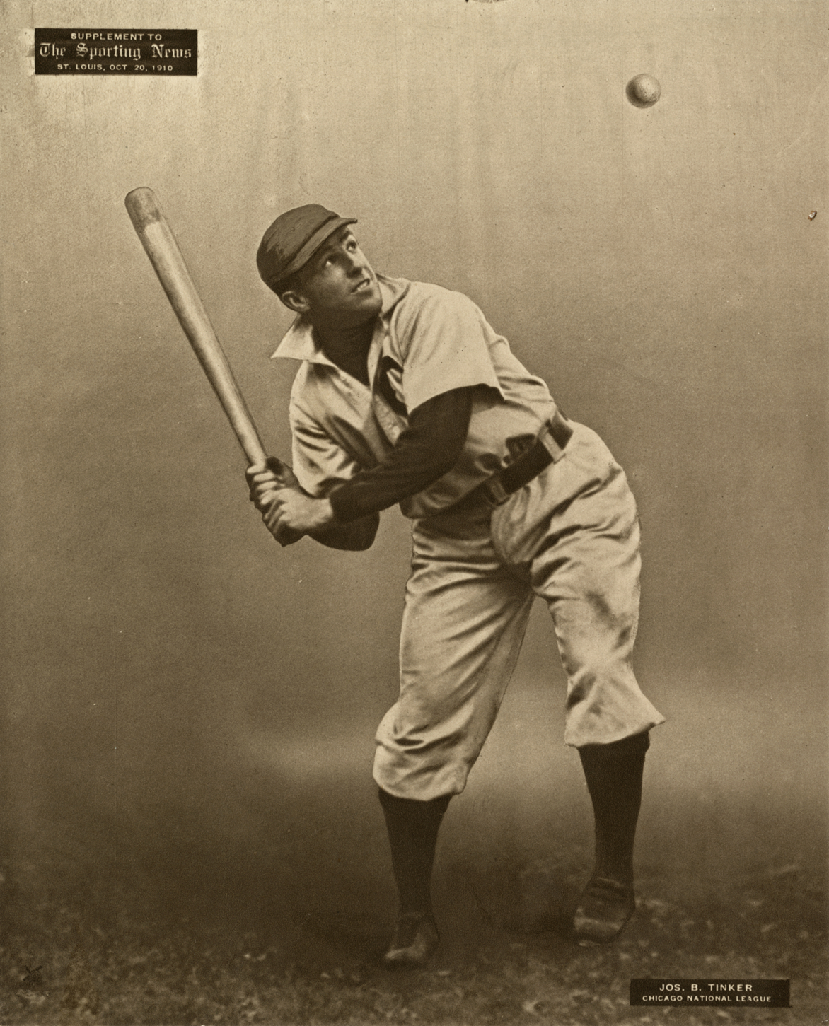Portrait of Joe Tinker, baseball player for the Chicago Cubs, at bat. Printed on front: "Jos. B. Tinker, Chicago National League. Supplement to the Sporting News, St. Louis, Oct. 20, 1910."