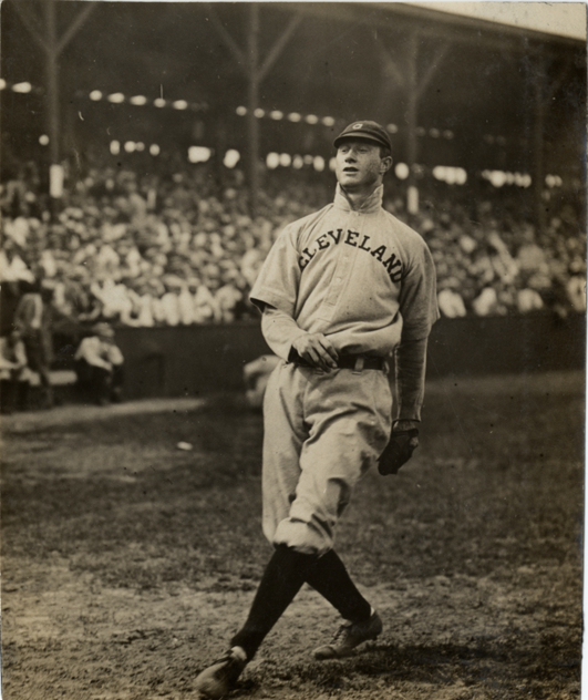 Cleveland Naps pitcher Spec Harkness on field. Stands filled with fans behind. Handwritten on back: "Harkness, Fred (Cleve[land]). 1910."