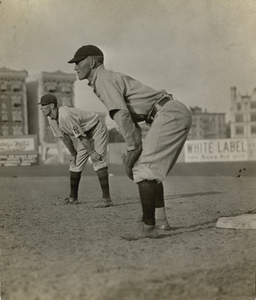 Portrait of George Stovall, baseball player for the Cleveland Naps, waiting on base. Player in New York uniform stands nearby. Stamped on back: "Charles M. Conlon, 216 W. 111th St., New York." Handwritten on back: "Geo. Stovall, Cleve., 1908."