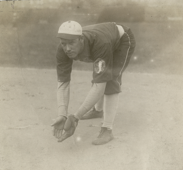 Portrait of Frank Isbell, baseball player for the Chicago White Sox, reaching for a ground ball. Handwritten on back: "Frank Isbell, White Sox."
