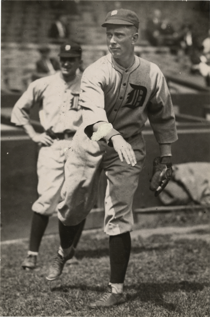 Detroit Tigers pitcher Jim Middleton pitching on field. Mostly empty stands and another player behind. Handwritten on back: "Jas Middleton. 1921. Detroit."