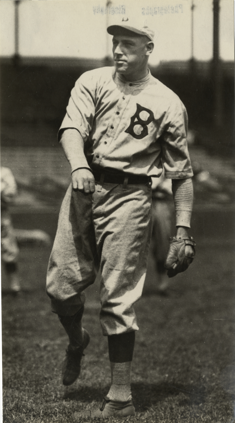 Brooklyn Robins pitcher Jeff Pfeffer pitching on field. Handwritten on back: "E.J. Pfeffer."