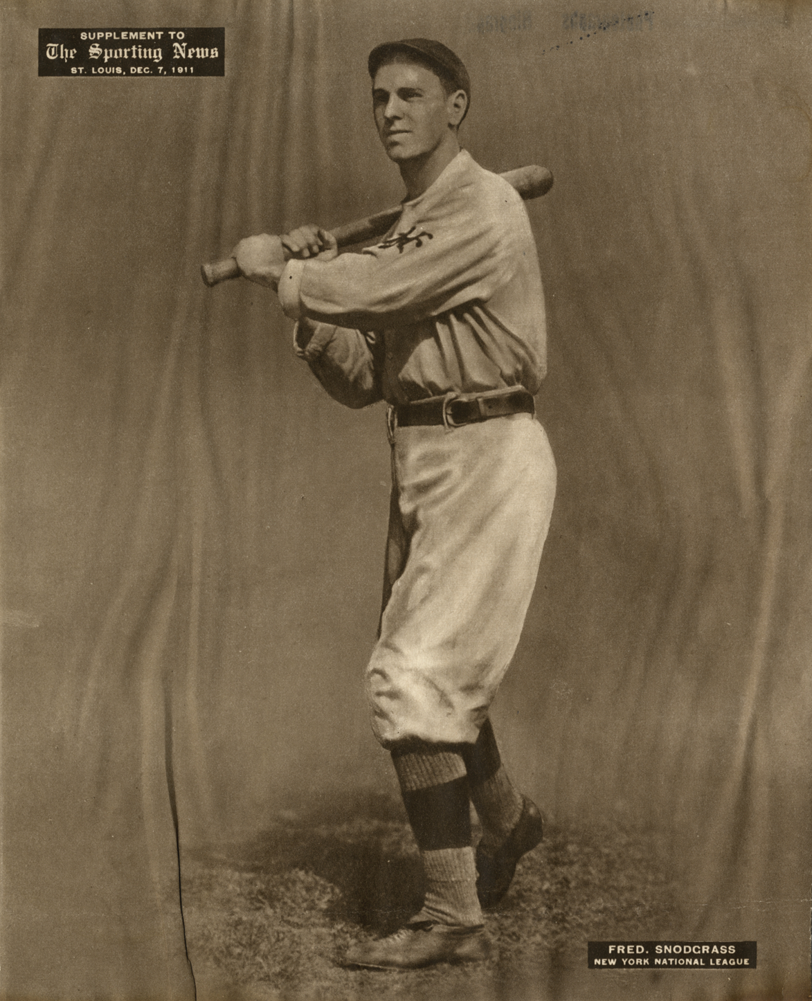 Portrait of Fred Snodgrass, baseball player for the New York Giants, holding a baseball bat. Printed on front: "Fred. Snodgrass, New York National League. Supplement to the Sporting News, St. Louis, Dec. 7, 1911."