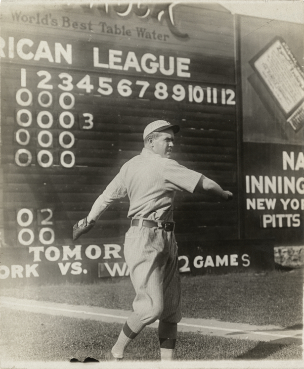Portrait of Glenn Liebhardt, pitcher for the Cleveland Naps. Scoreboard in background. Handwritten on back: "Liebhardt, Cleveland."