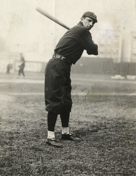 Portrait of Frank Schulte, baseball player for the Chicago Cubs, holding a baseball bat. Stamped on back: "Charles M. Conlon." Handwritten on back: "Schulte, Frank."