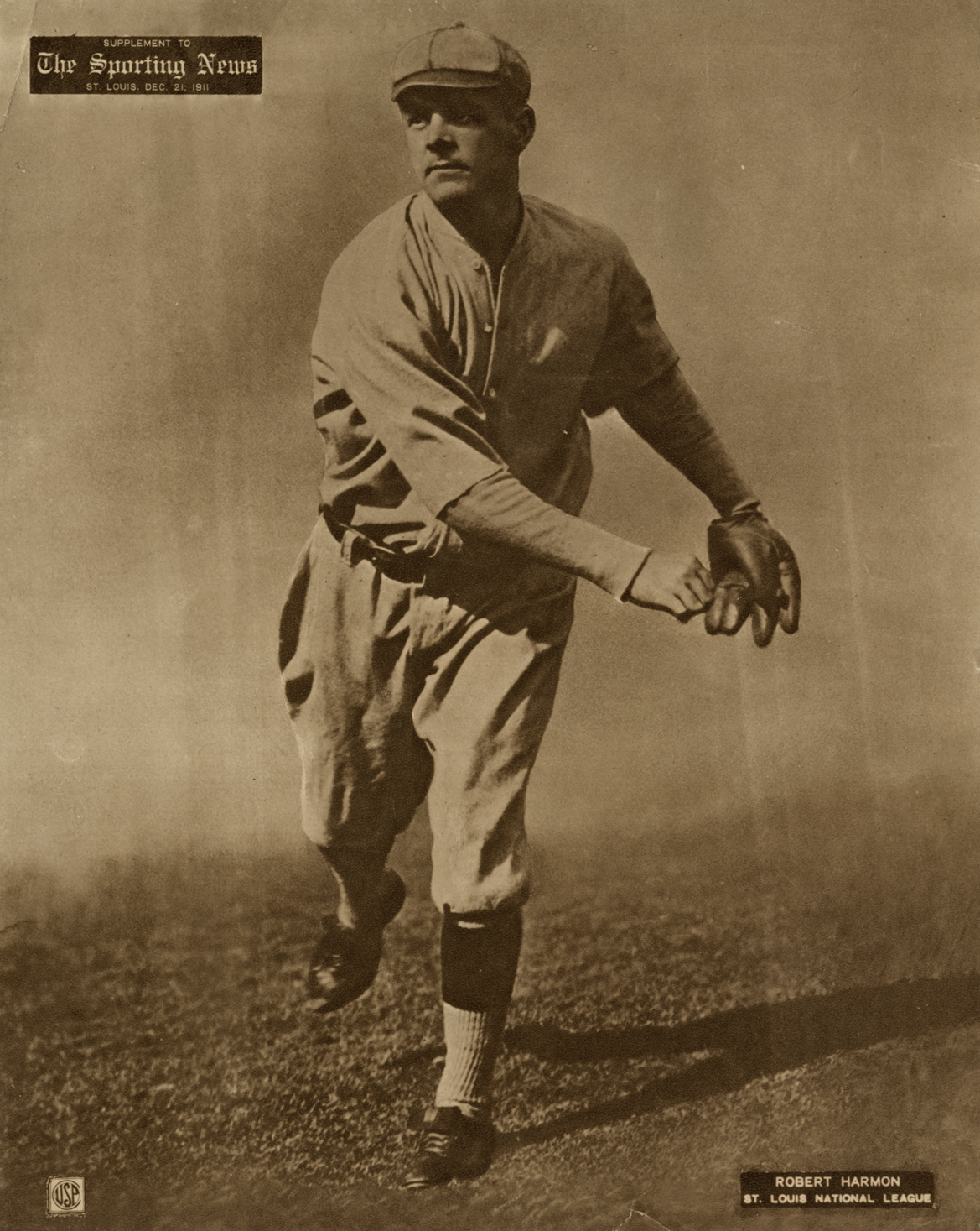 St. Louis Cardinals pitcher Bob Harmon pitching on field. Printed on front: "Supplement to the Sporting News, St. Louis, Dec. 21, 1911. Robert Harmon, St. Louis National League. U.S.P."