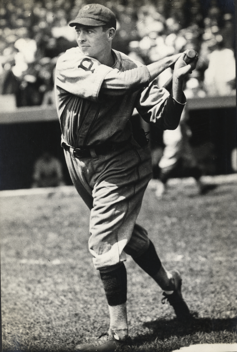 Portrait of baseball player Glenn Wright, wearing a Pittsburgh Pirates uniform and holding a baseball bat. Typed on label: "Glenn Wright, 1929-31." Dates on label reflect affiliation with Brooklyn club.