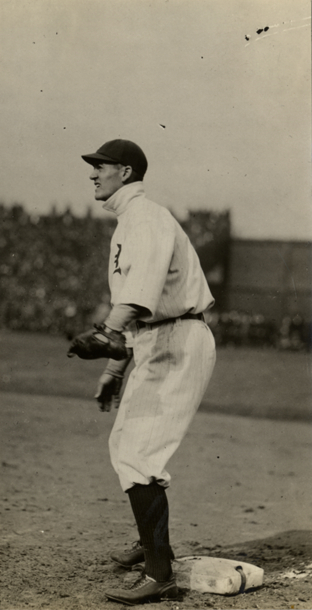 George H. Burns in Detroit Tigers uniform on base. Handwritten on back: "Burns, George. 1915."