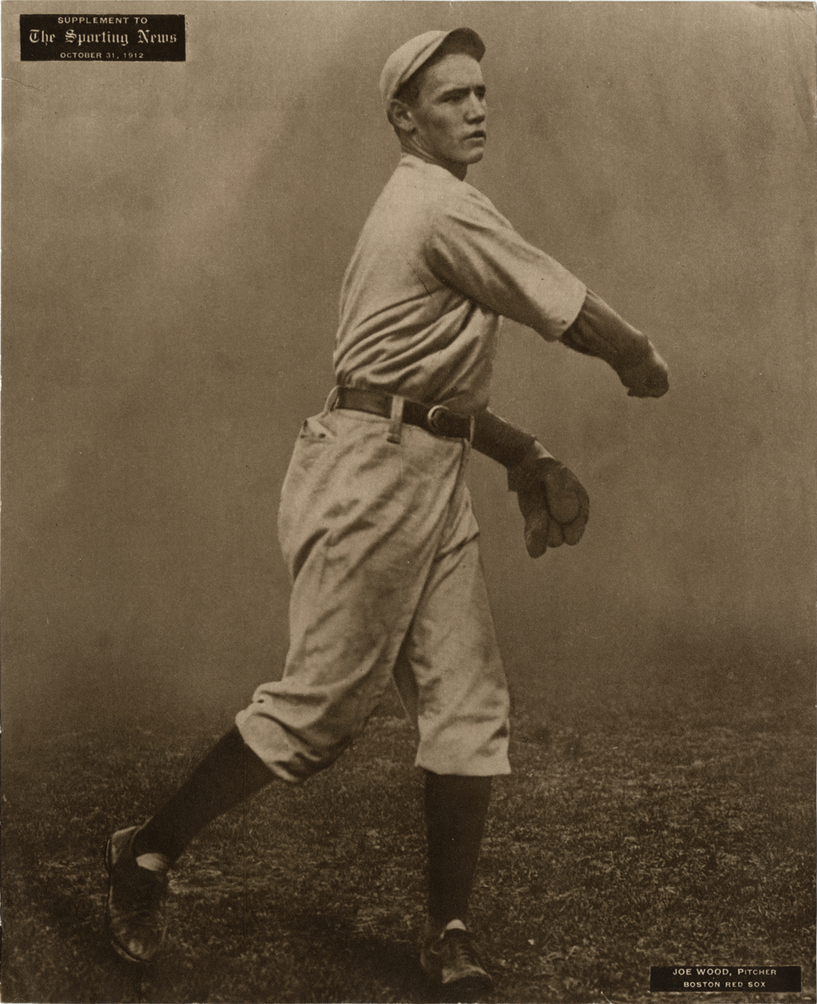 Boston Red Sox pitcher Joe Wood pitching on field. Printed on front: "Supplement to The Sporting News. October 31, 1912. Joe Wood, pitcher. Boston Red Sox."