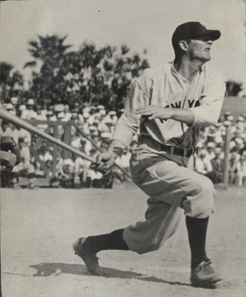 Portrait of George Selkirk, baseball player for the New York Yankees, swinging a baseball bat. Typed on label: "Geo. A. Selkirk, Yankees, 1936."