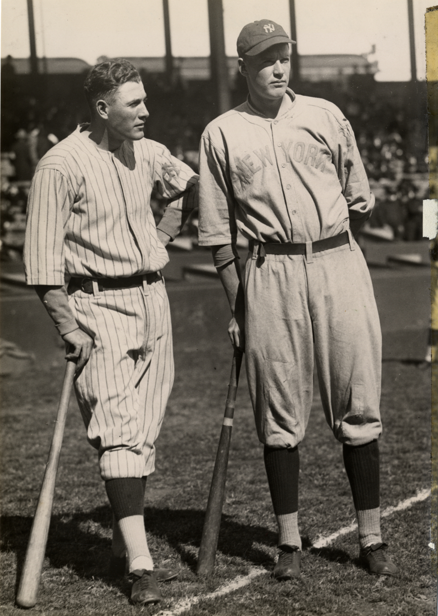 Brothers Irish and Bob Meusel standing on field. Handwritten on back: "Irish (Emil) and Bob Meusel. World's Series, 1921."