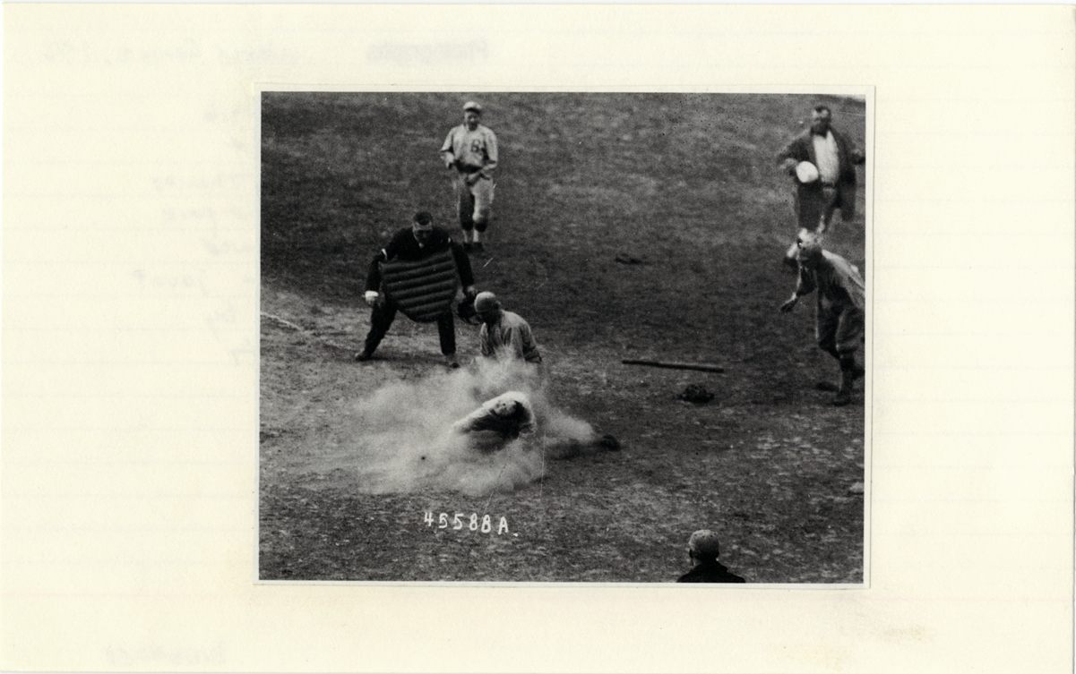 Jake Daubert of Brooklyn Robins being tagged out. Handwritten on back: "Action in the third game of the 1916 World Series: Brooklyn's Jake Daubert is tagged out [by] Boston catcher Pinch Thomas after trying to leg out an inside-the-park home run. Daubert's dash foreshadowed a more famous--and more successful--jaunt around the bases seven years later by teammate Casey Stengel. [text crossed out: who is closely watching the play at right]"