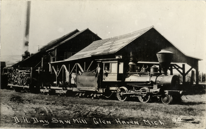 View of two men posing with a locomotive at the the D.H. Day Saw Mill, Glen Haven, Michigan. Railroad flat car with lumber in background. Printed on front: "D.H. Day Saw Mill, Glen Haven, Mich."