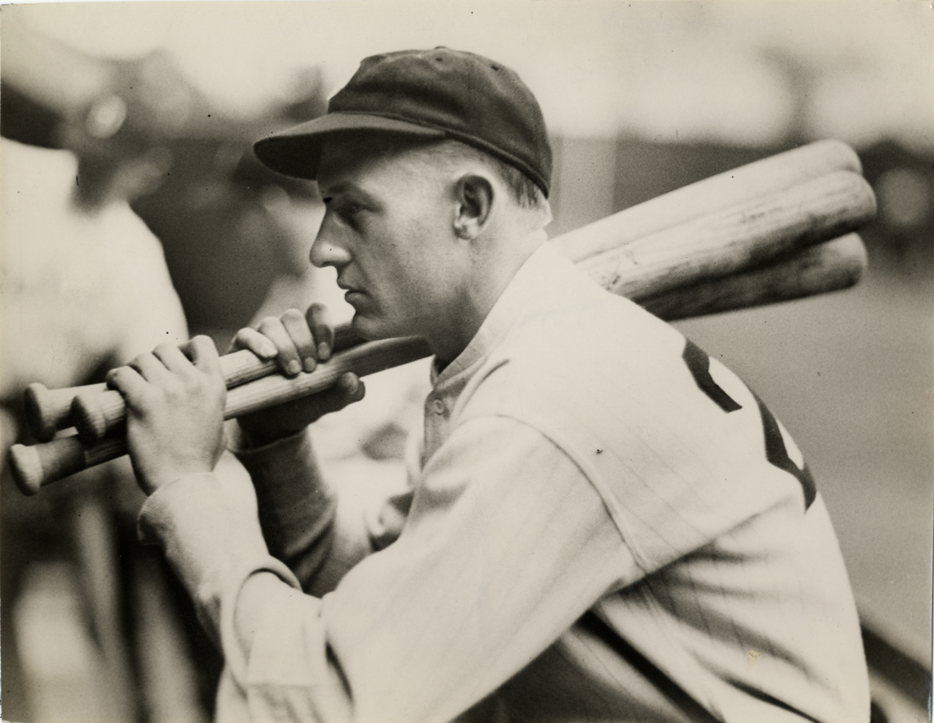 Portrait of Detroit Tigers center fielder Jo-Jo White, with bats over shoulder. Handwritten on back: "Joyner (Jo-Jo) White."